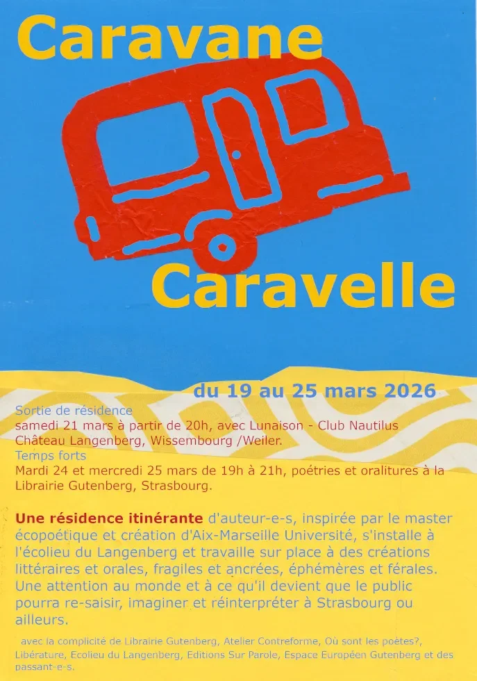 La résidence s’est achevée par une restitution sous forme de lectures musicales et collectives au sein de l’écolieu, puis d’un micro ouvert dans la librairie Gutenberg, à Strasbourg, dans le cadre du Printemps des poètes.